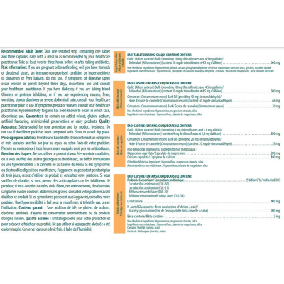 If you are pregnant or breastfeeding; or if you have stomach or duodenal ulcers, an immune-compromised condition or hypersensitivity to cinnamon or Peru balsam, do not use. If symptoms of digestive upset occur, worsen or persist beyond three days, discontinue use and consult your healthcare practitioner. If you have diabetes; if you are taking blood thinners or protease inhibitors; or if you are experiencing nausea, fever, vomiting, bloody diarrhoea or severe abdominal pain, consult your healthcare practitioner prior to use. If symptoms persist or worsen, consult your healthcare practitioner. Hypersensitivity to garlic has been known to occur; in which case, discontinue use. Guaranteed to contain no added wheat, gluten, sodium, artificial flavouring, antimicrobial preservatives or dairy products.