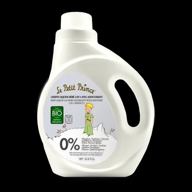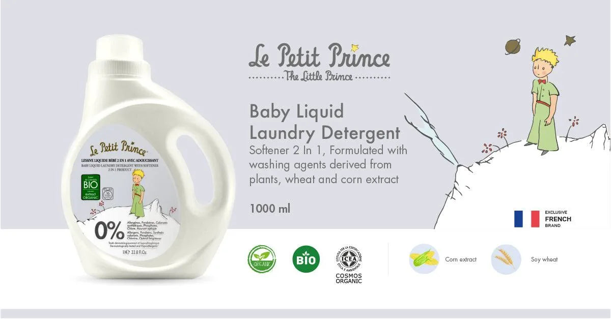 The 2 in 1 Liquid Laundry with Softener from Le Petit Prince line, is with organic Calendula Officinalis flowers extract. It is especially formulated with mild cleansing agents derived from plants, for washing baby’s clothes that need special care. Its gentle formula effectively eliminates even the most stubborn stains, without irritating baby’s sensitive skin. – Its delicate scent offers long-lasting freshness. – 100% soluble formula that leaves no residue and protects sensitive skin. – A softening agent for guaranteed softness and easy ironing. Without synthetic colorants, without optical brightener, without phosphates and phosphonates, without chlorine. Format:1L Bottle Made in France. Detergent product, dermatologically and hypoallergenic. DID YOU KNOW? Le Petit Prince is a line of natural and organic baby care, from birth. Made in France and featuring the image of Saint Exupéry’s work of the same name, Le Petit Prince offers a line of products that respects the ethical values of using organic products in line with those of Homeocan