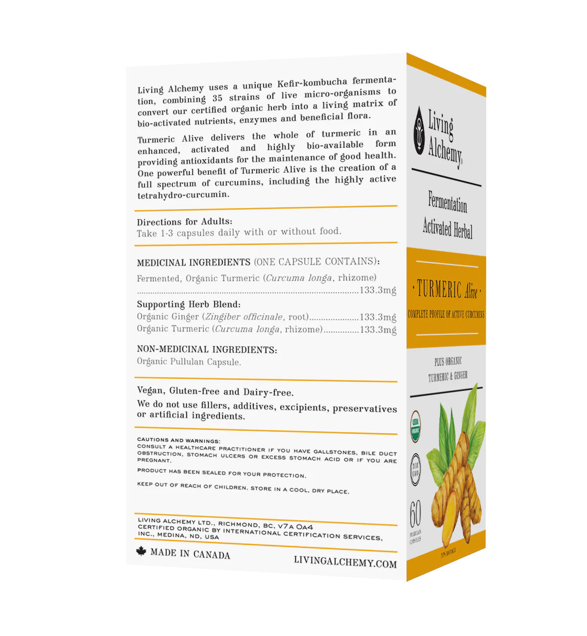 Turmeric Alive Award Winning Turmeric Alive is much more than just curcumin. In its whole form, turmeric provides many nutrients our bodies can use to help nourish and balance itself particularly when it comes to inflammation and oxidation. When we long ferment organic turmeric using our 35 strain Kefir-kombucha culture, the synergistic nutrients transform into something even more powerful. One type of compound created through our fermentation is tetrahydro-curcumin, which we call “white gold.” About 1000% more tetrahydro-curcumin is found in our fermented turmeric compared to non-fermented turmeric. This highly active compound has been shown to have complementary actions to other curcumins within whole turmeric especially for anti-inflammatory and anti-oxidant action. Our unique fermentation creates a bio-available form of activated whole turmeric that becomes water soluble and more nutrient dense. No black pepper. No nano particles. Its fermented whole food after all – nothing needs to be added. Only in its natural, whole, fermented state can Turmeric provide the fully activated synergy of nature. USDA Certified Organic, Non-GMO, 100% Natural Whole Food Supplement Fermented, whole herb - no isolates .Vegan, Gluten and Dairy Free .Made in Canada .Free from excipients, binders, additives, and any artificial ingredients or chemicals