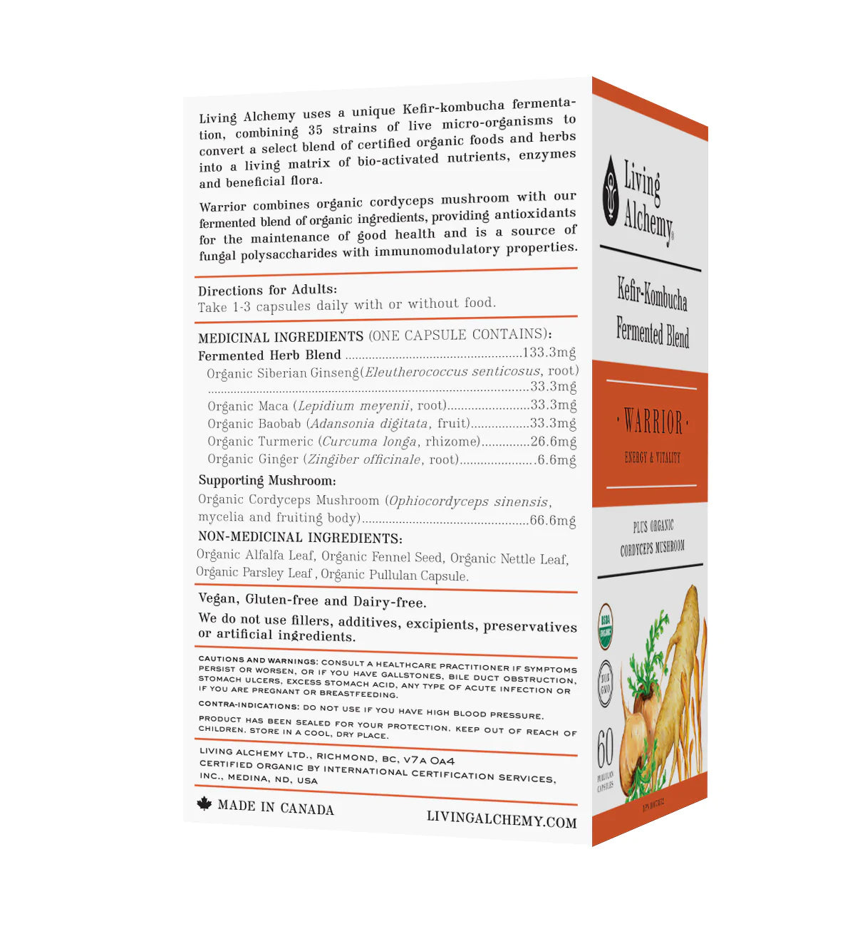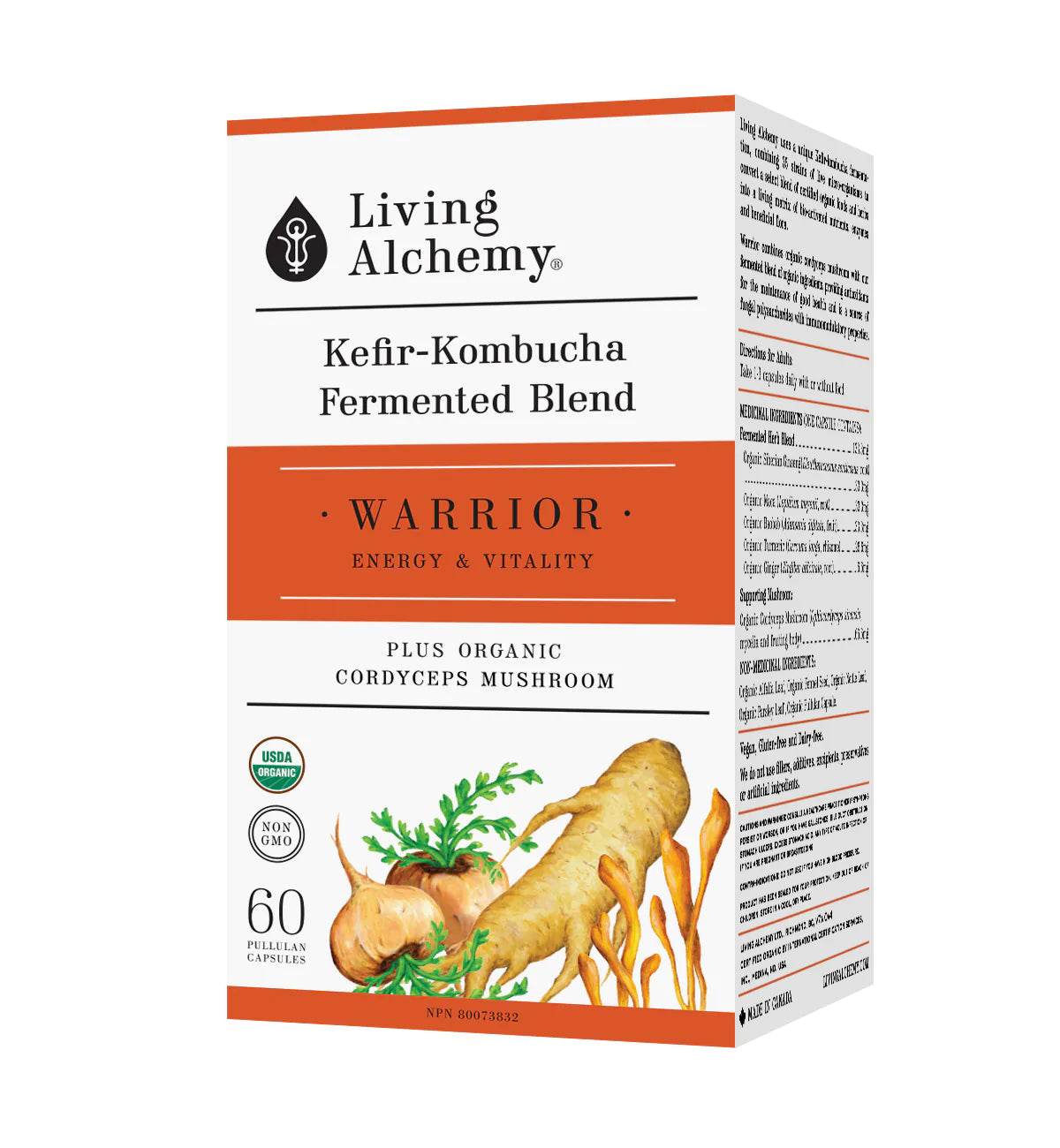 Unleash your inner WARRIOR with a fermented, activated blend of siberian ginseng, maca, baobab, turmeric & ginger plus cordyceps mushroom. Support for balanced hormones, vigor and everyday vitality for both women and men. Living Alchemy use a unique Kefir-kombucha fermentation, combining 35 strains of live micro-organisms to convert a select blend of certified organic foods and herbs into a living matrix of bio-activated nutrients, enzymes and beneficial flora. .USDA Certified Organic, Non-GMO, 100% Natural Whole Food Supplement .Vegan, Gluten and Dairy Free .Made in Canada .Free from excipients, binders, additives, and any artificial ingredients or chemicals