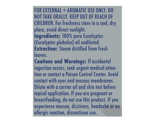 If accidental ingestion occurs, seek urgent medical atten- tion or contact a Poison Control Center. Avoid contact with eyes and mucous membranes. Dilute with a carrier oil and skin test before topical application. If you are pregnant or breastfeeding, do not use this product. If you experience nausea, dizziness, headache or an allergic reaction, discontinue use.