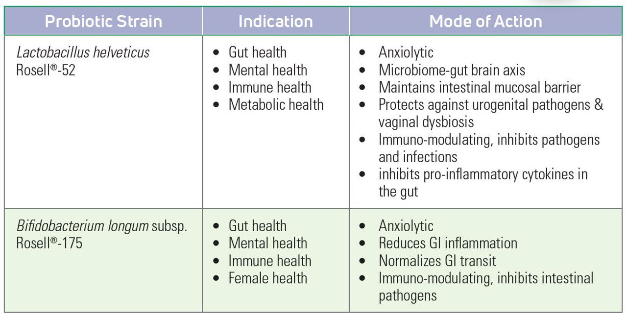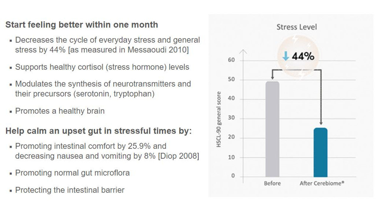 In addition to promoting normal gut microflora and a strong intestinal barrier, these psychobiotic strains work to enhance mood, calm stress induced gut symptoms (nausea, vomiting, pain), alleviate general feelings of anxiety and mild depression, improve sleep quality, and support cortisol levels for a healthy response to everyday stress.
