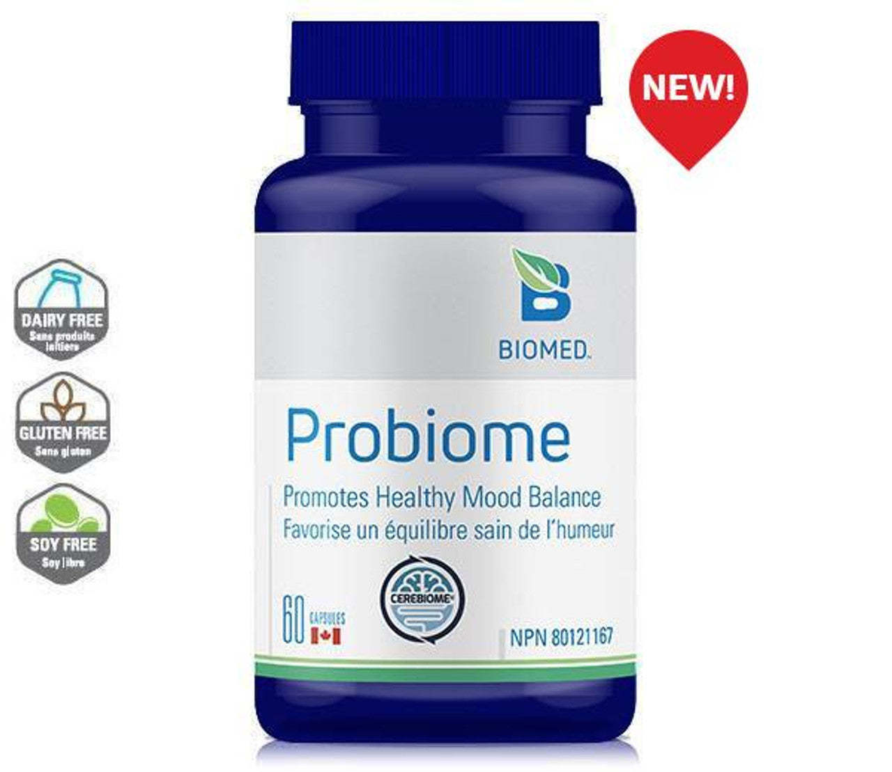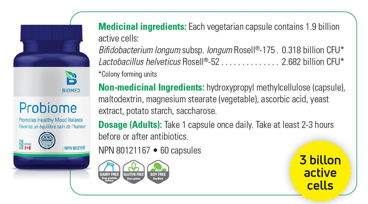 Probiome includes the Cerebiome® psychobiotics, the most documented probiotics to support mood, stress, and mental wellbeing, The Institut Rosell is a pioneer in probiotic manufacturing, which produces the probiotic strains found in Cerebiome® (Bifidobacterium longum subsp. Longum Rosell®-175 and Lactobacillus helveticus Rosell®-52). Five human clinical studies have proven these strains help enhance mood due to their actions on the microbiome-gut-brain axis through supporting a healthy response to everyday stress.
