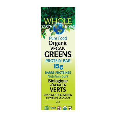 The Whole Earth & Sea Pure Food Vegan Greens Protein Bar is the next generation of on-the-go whole-food nutrition. The ingredients are 80% raw and 100% gluten free, organic, non-GMO, and kosher. Based on science, it is one of the most nutritionally robust and alkaline-forming bars on the market – and it doesn’t sacrifice one bit on flavour. This convenient, deliciously satisfying bar is covered in antioxidant-rich dark chocolate. Each bar has 15 g of high-quality vegan protein, making it the perfect choice for between-meal snacking or post-workout recovery.