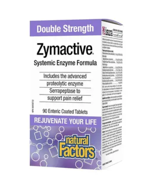 Natural Factors Double Strength Zymactive is a systemic enzyme formula with more than four times the potency of other proteolytic enzyme supplements. The unique combination of proteolytic enzymes breaks down proteins that cause inflammation and pain. The tablets are enteric coated to protect the enzymes from stomach acid during digestion.